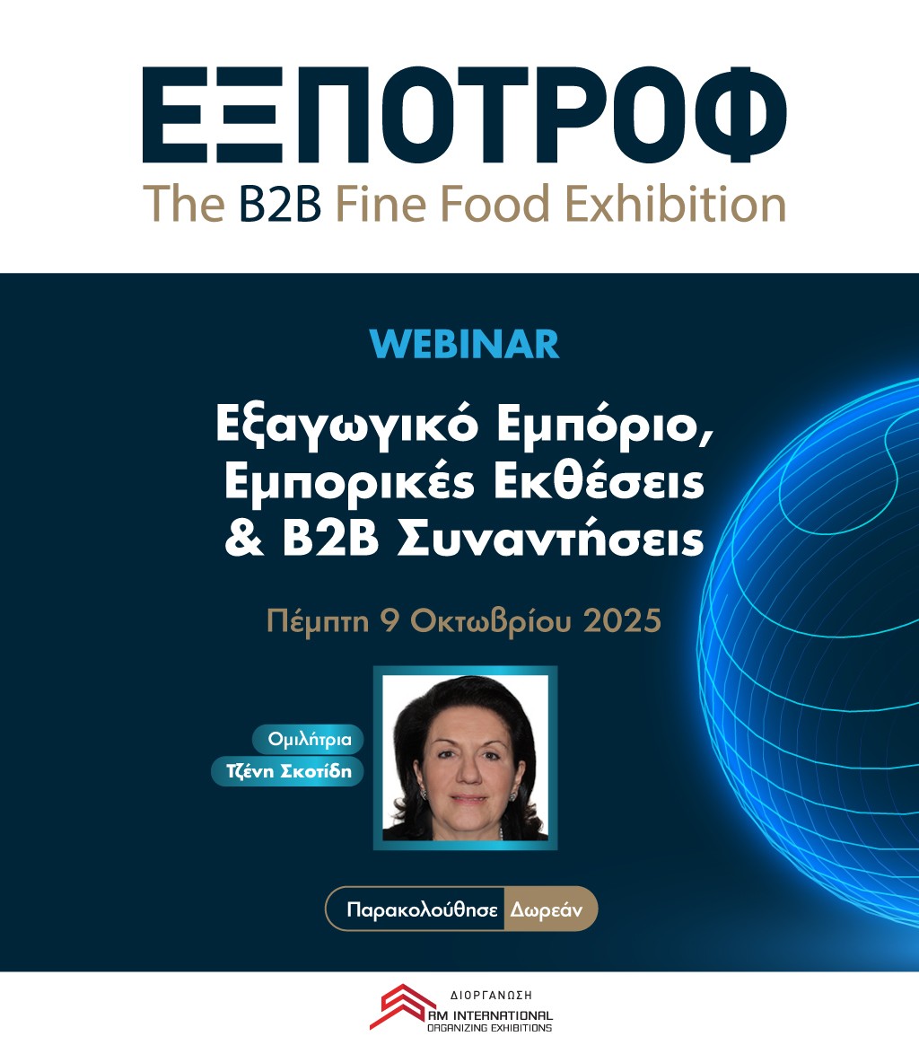 Η RM INTERNATIONAL, στο πλαίσιο της ΕΞΠΟΤΡΟΦ, σας προσκαλεί σε ένα δωρεάν online webinar την Πέμπτη 9 Οκτωβρίου 2025, στις 18:30, με θέμα:«Εξαγωγικό Εμπόριο – Εμπορικές Εκθέσεις & B2B Συναντήσεις». Ομιλητής του webinar είναι η Τζένη Σκοτίδη, διευθύντρια της Simply Exports, η οποία φέρνει μαζί της μια σπάνια εμπειρία 30+ ετών στον τραπεζικό χώρο, με…